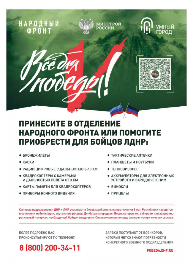 1.Сбор средств на закупку необходимых товаров для фронта: квадрокоптеров, тепловизоров, средств связи, бронежилетов, защитных шлемов, генераторов, компьютерной техники, аптечек, мягких носилок, спальных мешков.